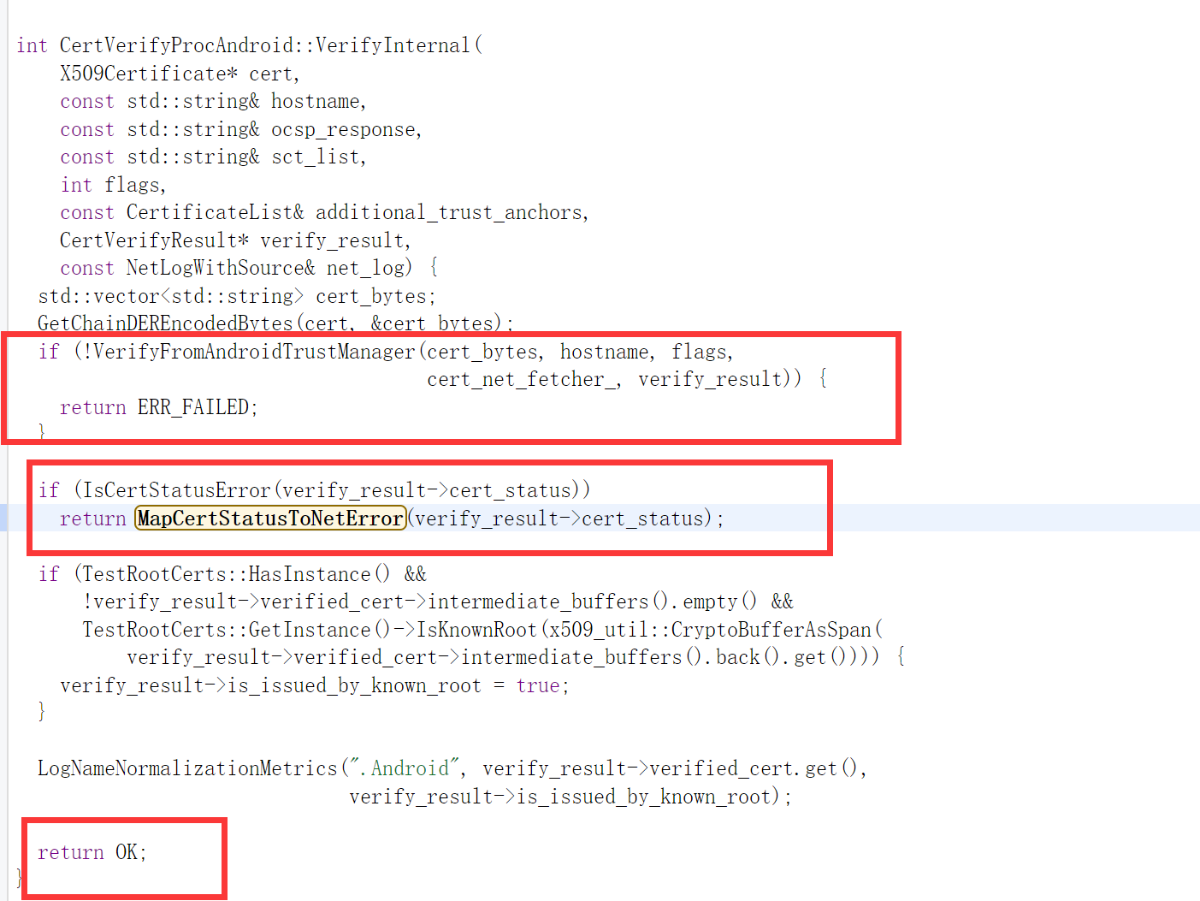 在VerifyInternal这个函数里,先用TrustManager校验了一番,如果发现校验结果verify_result的cert_status出现了error,则直接将错误映射后返回。如果没有错误则检查了证书的发布者是否为known_root,然后返回OK。