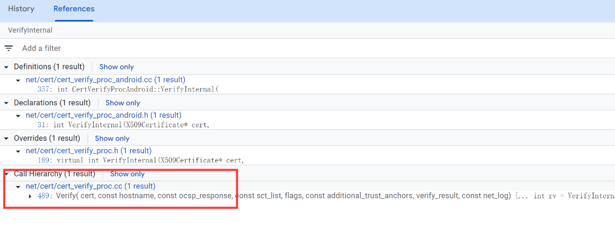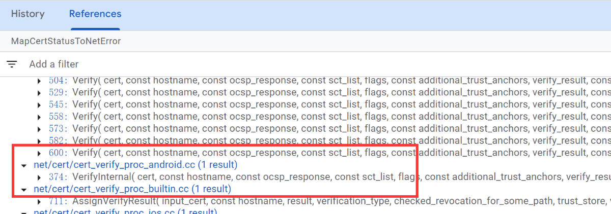 在一个cert_verify_proc_android.cc的文件里被引用。这个文件名已经暗示了在检查/校验证书,我们点进去看看: