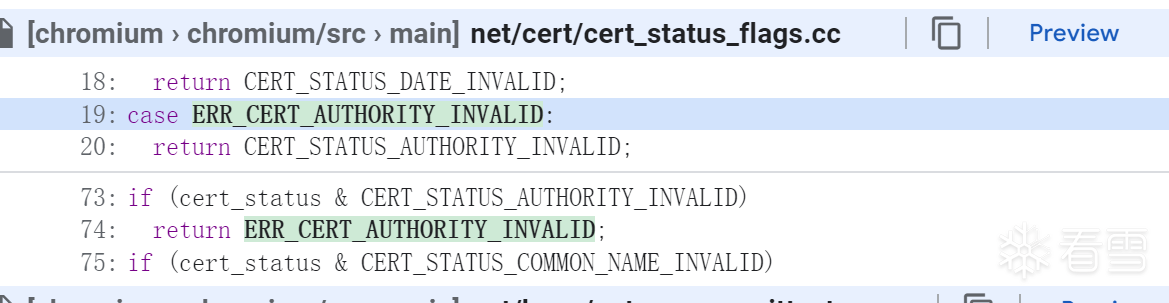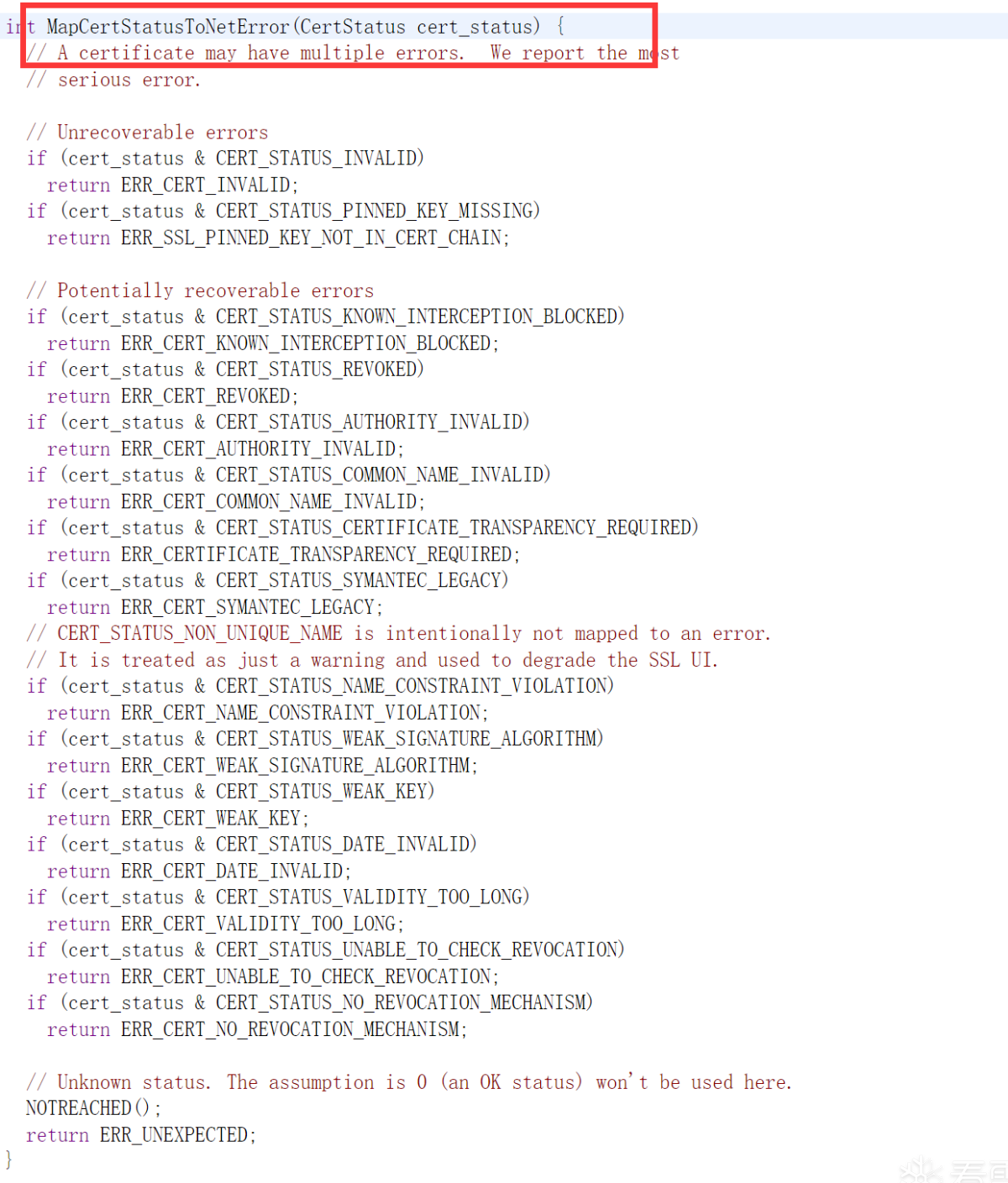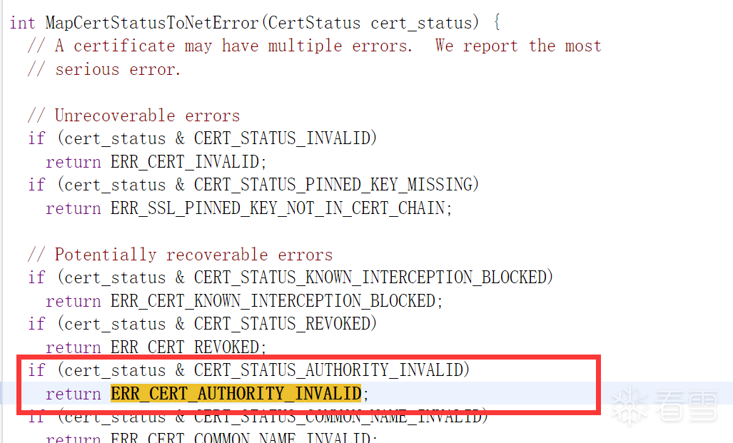 发现 一个叫做MapCertStatusToNetError 的函数里,返回了这个ERR_CERT_AUTHORITY_INVALID。