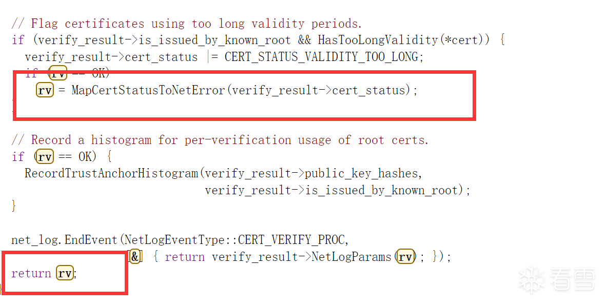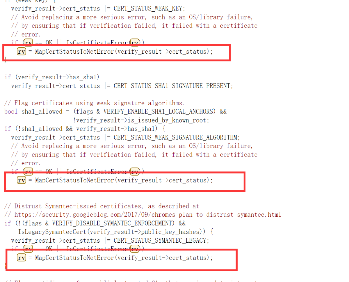 发现了与Verify函数相似的结构:判断rv是否ok,ok则进一步检查,并通过MapCertStatusToNetError函数给赋值。