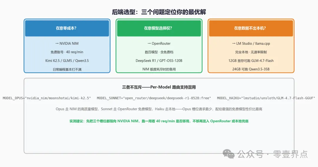 混用策略比单一后端灵活:把 Opus 槽位指向 NIM 里质量最高的模型(Kimi K2.5 或 MiniMax M2.5),Haiku 槽位指向本地轻量模型。Opus 槽位的请求频率最低,配给最强的免费模型性价比最高。