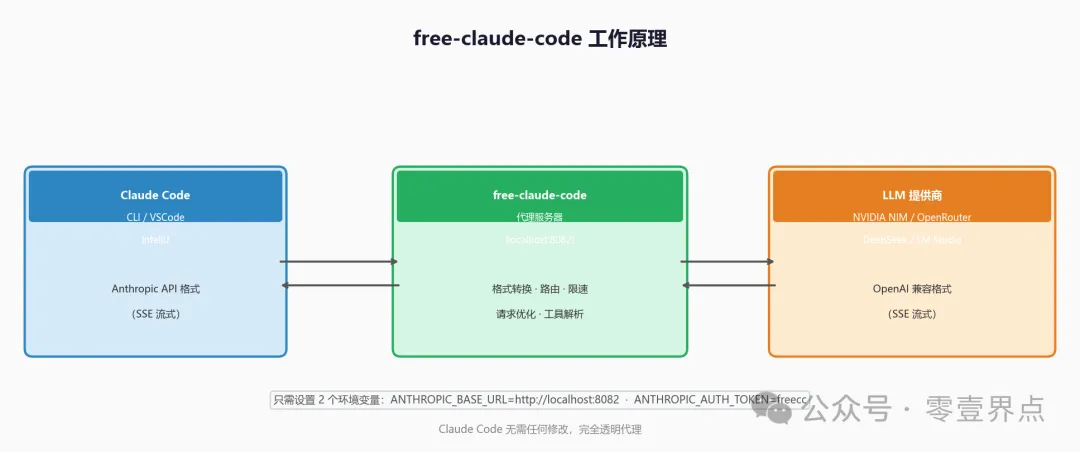 free-claude-code 就是那个本地代理。它在 :8082 端口监听,把 Claude Code 发来的 Anthropic 格式请求,翻译成 OpenAI 兼容格式,转发给 NVIDIA NIM、OpenRouter 或本地模型,再把响应原路翻回来。整个链路对 Claude Code 透明。
